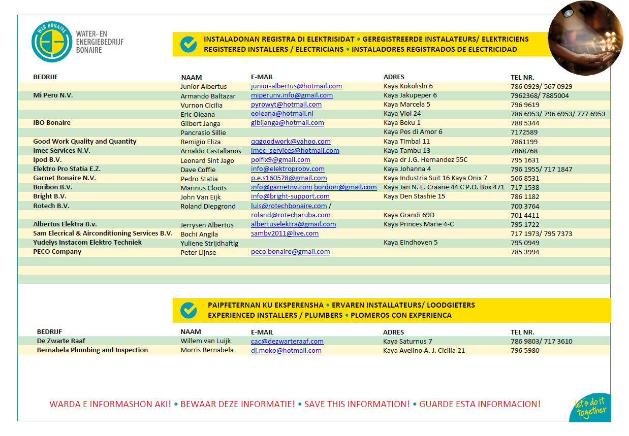 It can be difficult to find a competent installer to be distinguished from a ‘shyster’. For your safety WEB maintains a list of registered installers and experienced plumbers. Every year the list is drawn up by the Directorate Supervision and Enforcement (DTH) of the Public Entity Bonaire.